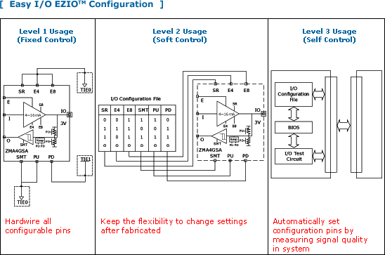 The EZIO™ is a proprietary technology that empowers all Faraday's I/O cells with easily configurable features such as real time change I/O on "Silicon", match output impedance to transmission line loading, and the elimination of noise. The table below shows 3 examples of EZIO™ applications.